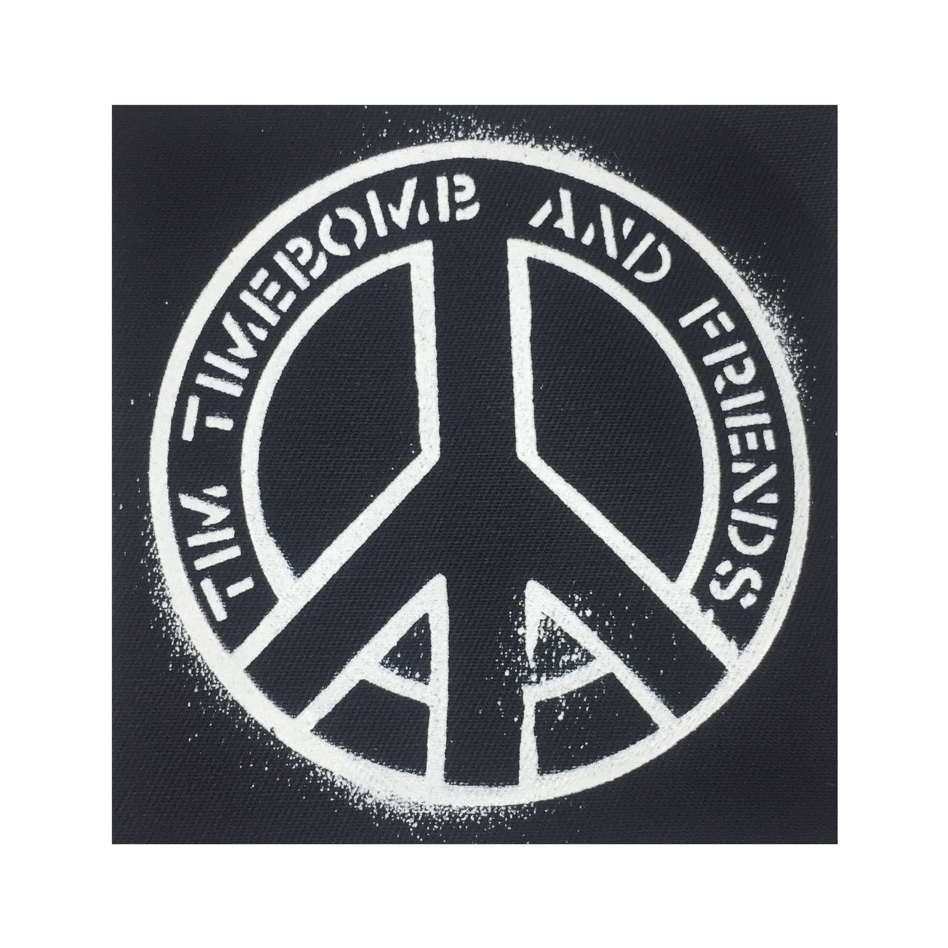 The Tim Timebomb and Friends Peace Logo printed in white on a black cloth 4.5"x4.5" patch